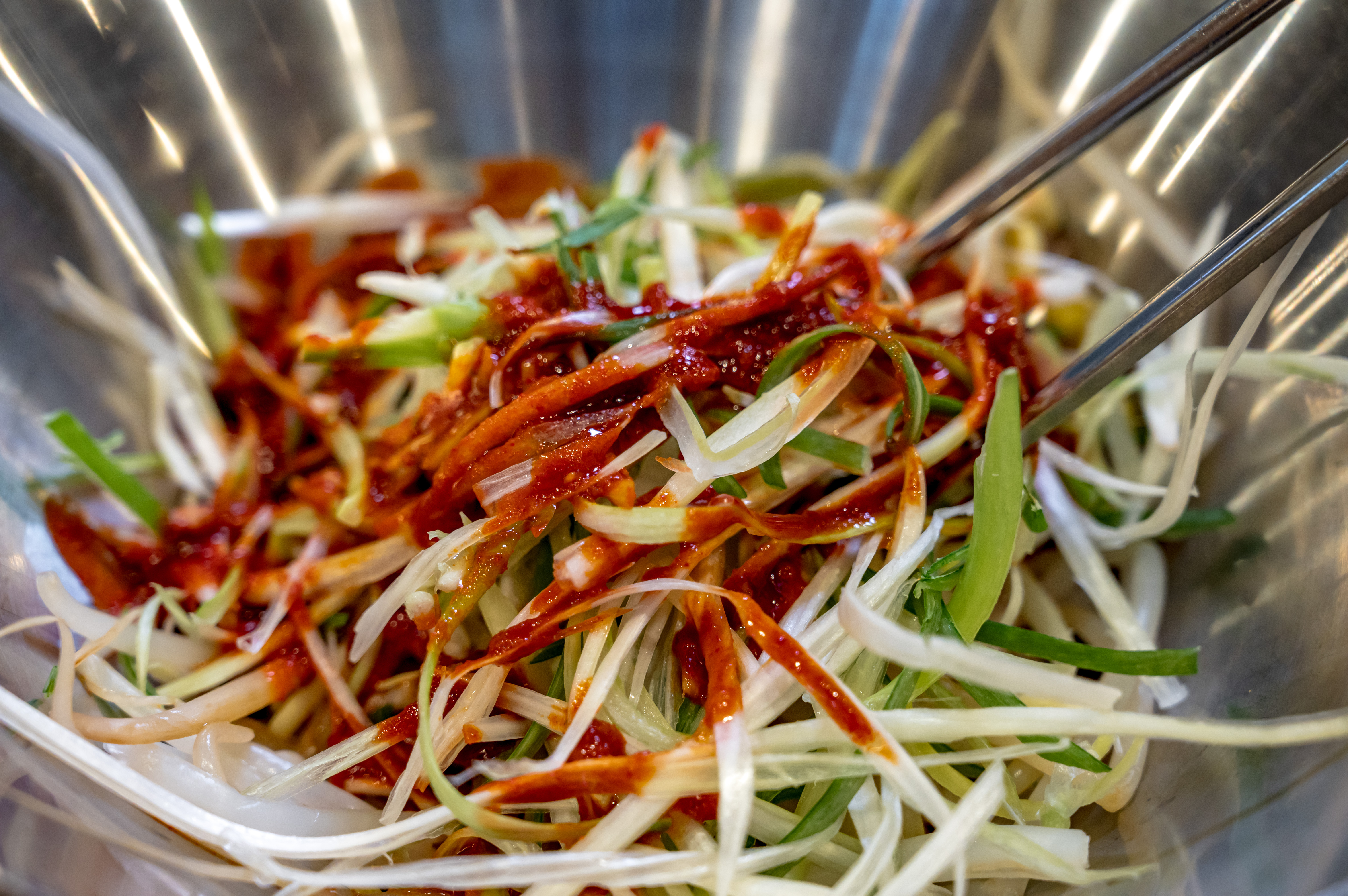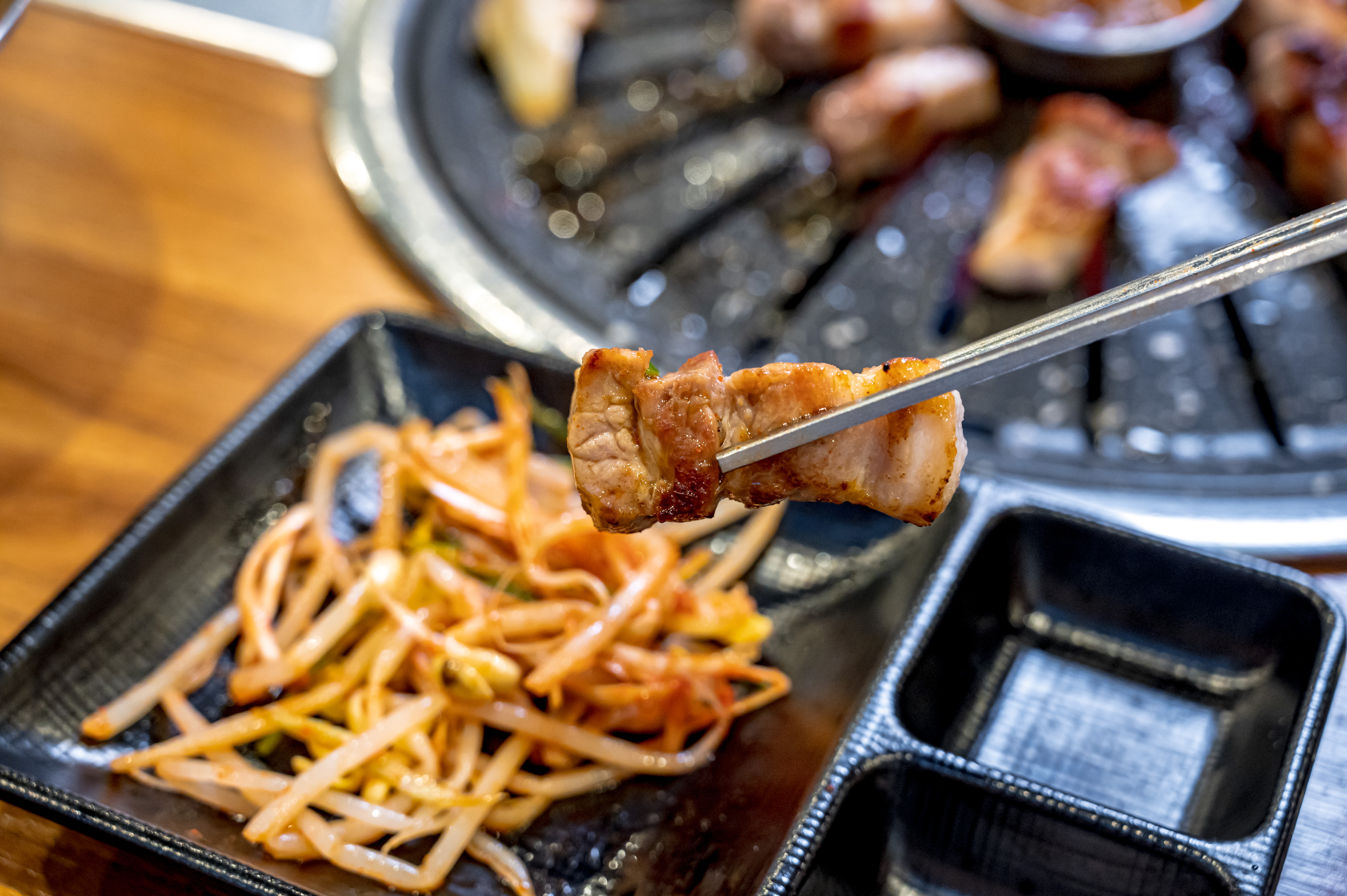 고기 어느정도 익은 것 같으니까 총알 장전. 파절이도 맛깔나게 버무려 봤어요. 이층고깃집은 일반 대파 채와 살짝 데친 콩나물이 함께 들어있는 파절이에요. 그래서 아삭한 콩나물 채즙까지 나오니까 씹는맛이 극대화돼서 너무 맛있었어요.