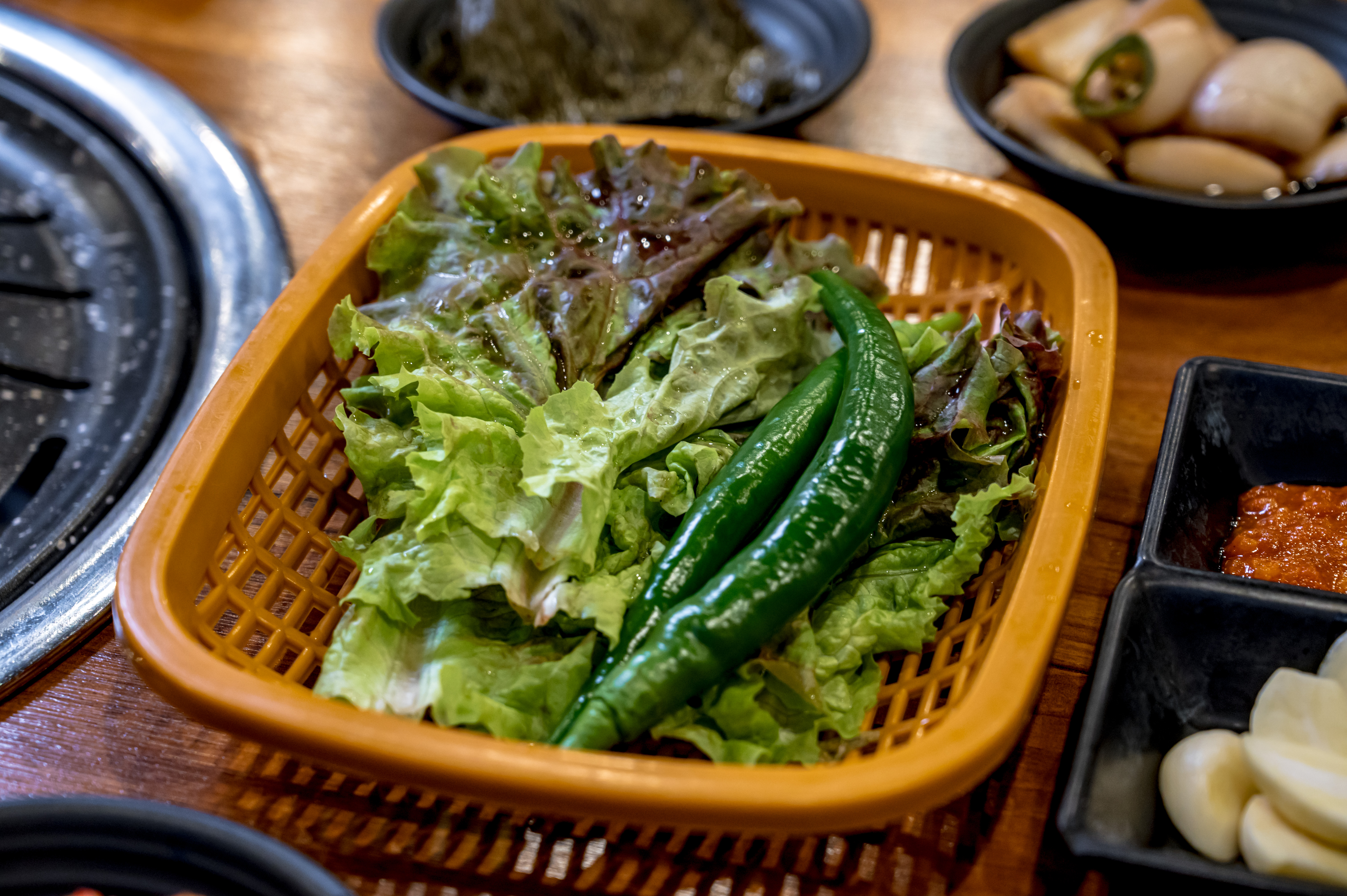 처음 세팅에 야채 적당히 주셨는데 고기 먹을때 쌈을 즐기는 편이라 나중에 추가로 더 담아와야겠다 생각했어요. 싱싱한 쌈채소와 곁들이는 밥상이 그렇게 몸에 좋다고 하더라고요.