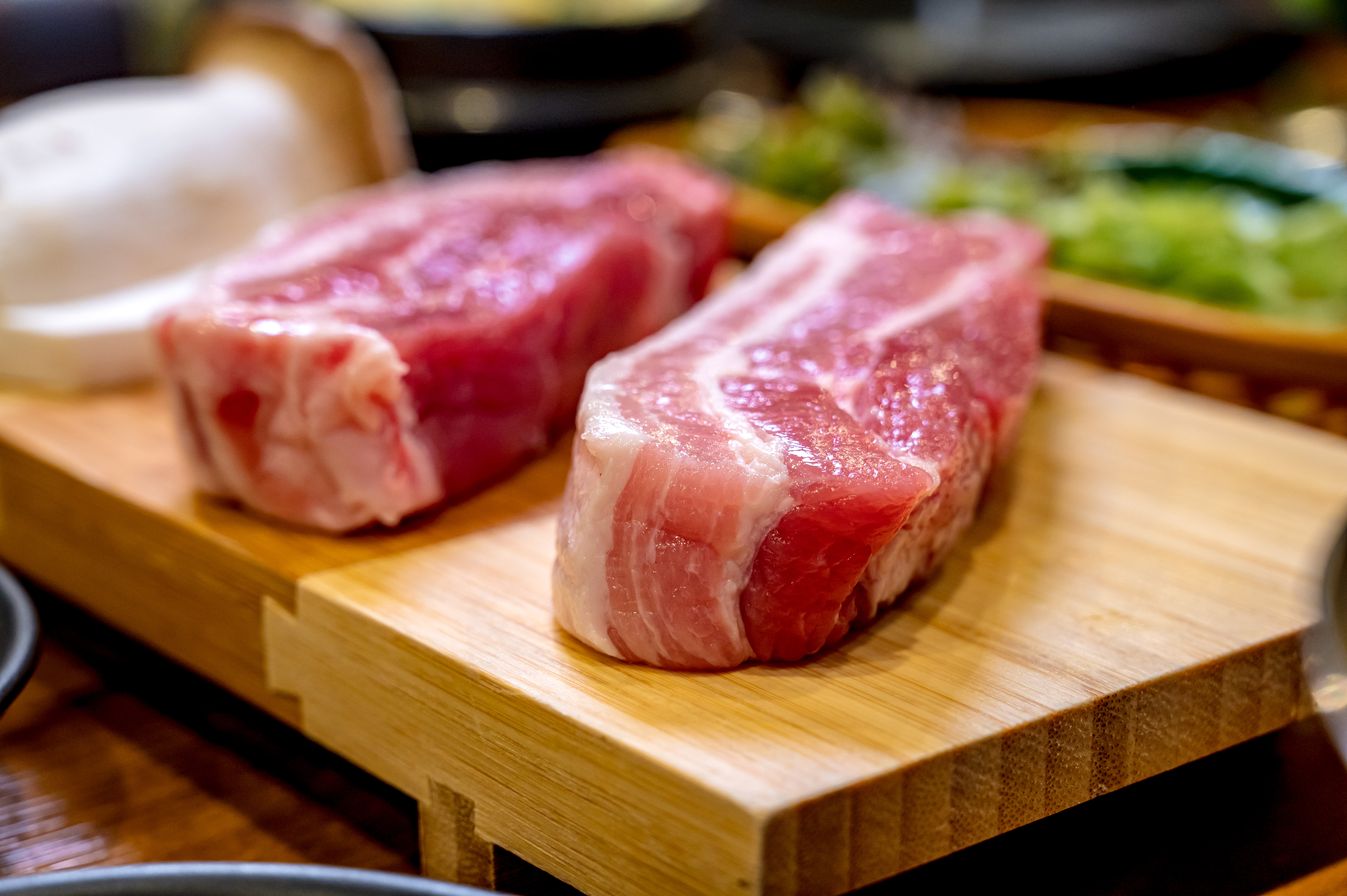 오늘의 메뉴는 영통 삼겹살! 생고기라서 윤기가 좌르르한게 이집만의 특징이고요. 엄청 두툼한 덩어리가 군침도는 비주얼이에요.