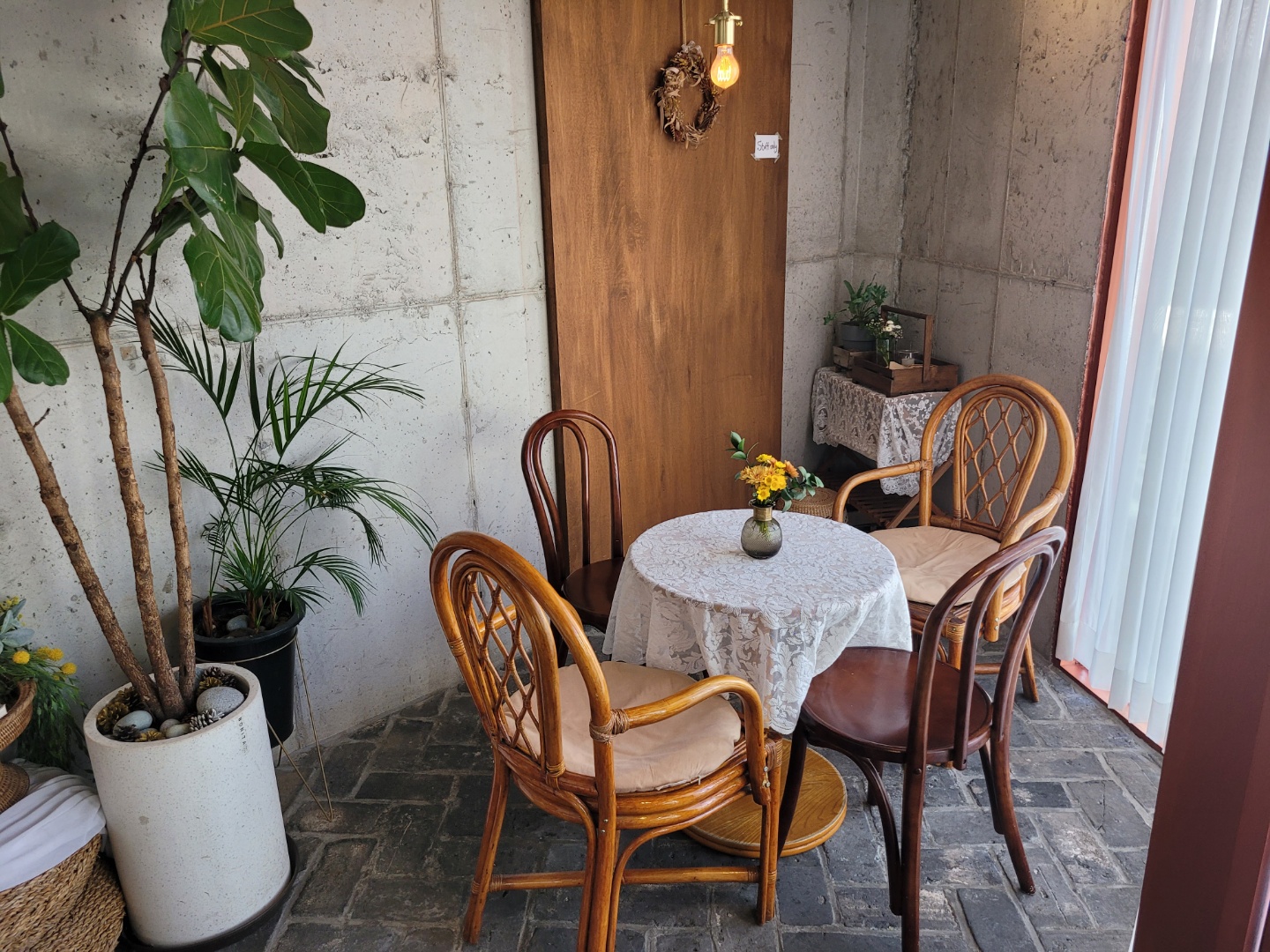 안쪽에도 다른 테이블이 있었는데 전주 디저트 맛집의 장점이라고 하면 테이블 모양이 같은게 거의 없다는 점이에요. 테이블 마다 개성이 있고 언발란스 하면서도 통일감이 느껴지는 분위기가 신기하고 예뻐보였어요.