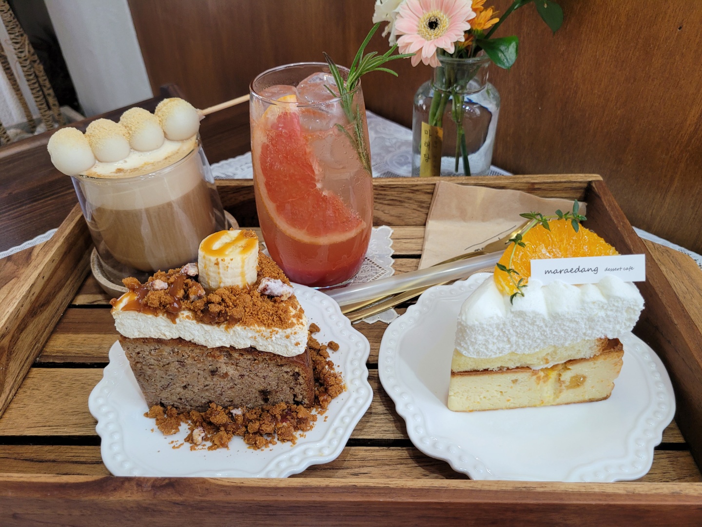 저희가 주문한 먹음직스러운 마래당의 케이크와 음료가 금세 준비되었습니다. 음료는 당고커피와 자몽에이드였고 구운바나나케이크, 오렌지치즈케이크였어요. 디저트 카페 많이 다녀봤지만 이렇게 신박한 비주얼에 뻔하지 않은 재료 조합까지 디저트 좋아하시는 분들이라면 완전 공감하실거에요!ㅜㅜ