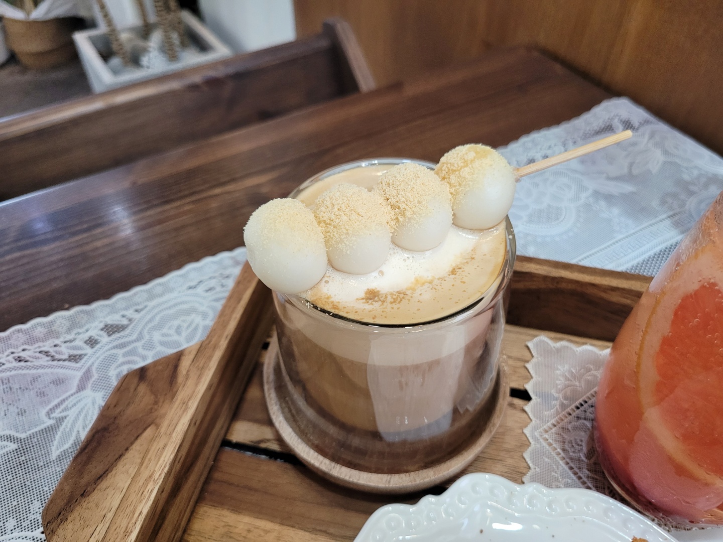 특히 마래당카페는 당고커피가 아주 유명한데요. 저희도 검색해볼때 리뷰에 거즘 당고커피 드신 후기가 많아서 호기심에 한잔 주문해봤어요. 쌀떡 당고가 곁들여진 커피는 어떤 맛일지 너무 궁금했어요~