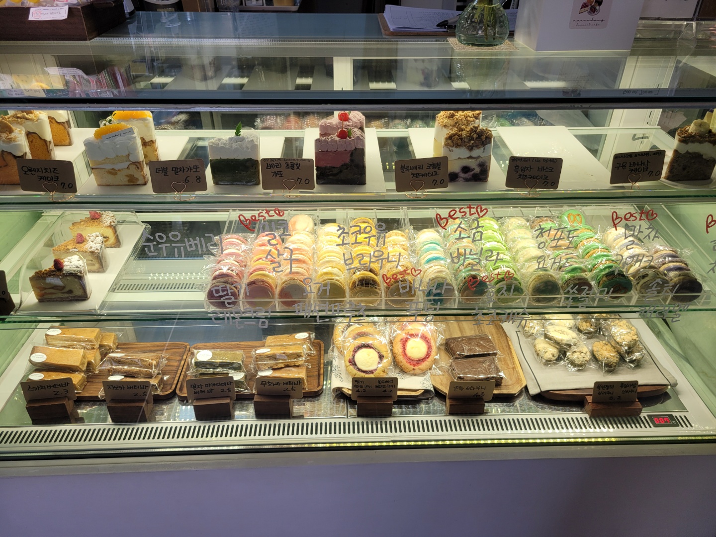 쇼케이스 안에는 전주 디저트 맛집 마래당에서 모두 직접만든 디저트 들이 가득 들어있었어요~! 구움 쿠키부터 케이크 종류까지 다양하고 심지어 글루텐프리인 디저트들까지 있어서 부담없이 취향껏 골라 먹기 너무 좋았죠.